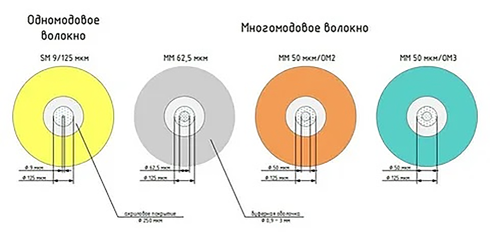 Не менее значимым является диаметр светопроводящей сердцевины и буфера: для одномодового волокна он составляет 9/125 мкм, а для многомодового волокна – 50/125 мкм или 62,5/125 мкм.