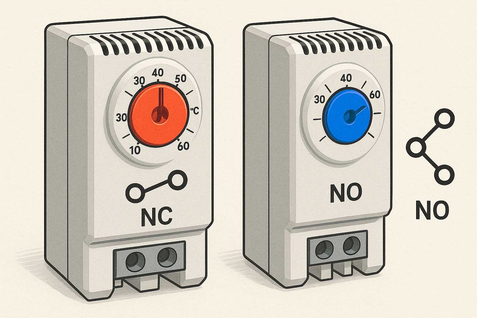 В термостатах с нормально замкнутым контактом (сокращенно NC) состояние замыкания сохраняется, пока температура окружающей среды ниже установленного уровня, заданного на ручке. В этом случае подключенное устройство, такое как обогреватель ОША, работает, так как необходимо поддерживать тепло в электрическом шкафу.