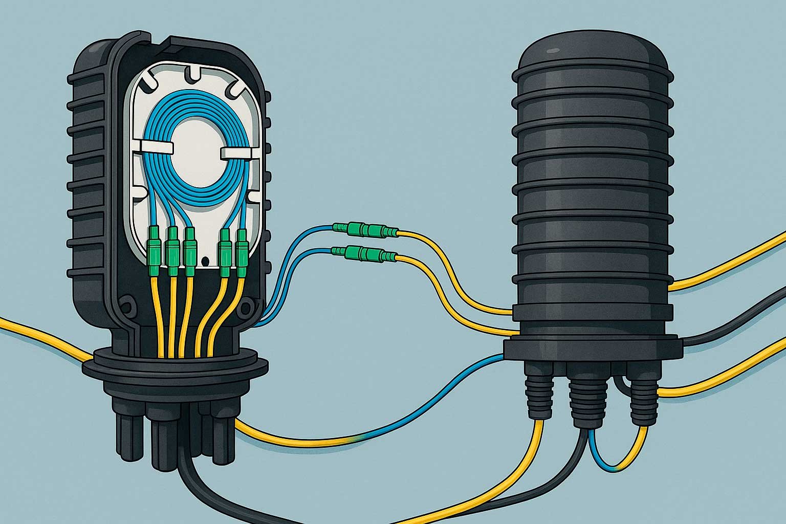 В наши дни функции оптических муфт значительно расширились. Помимо защиты, они также выполняют коммутационные задачи, позволяя выводить необходимые волокна для подключения к специализированному оборудованию. Эти устройства предназначены для соединения различных типов оптических кабелей, что делает их универсальными в разных условиях монтажа, будь то в земле, в кабельных каналах, тоннелях или на опорах воздушных линий.