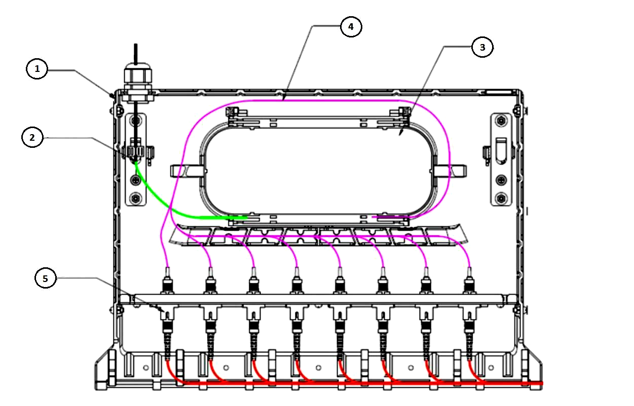 - Элементы ввода многоволоконного ОК (сюда входят необходимые технологические отверстия в корпусе, элементы крепежа ОК, необходимые заглушки и хвостовики)