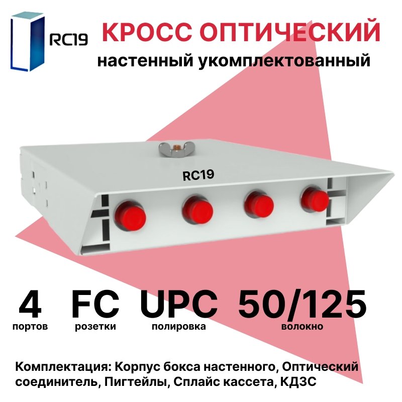 Описание RC19 ШКОН-У-4-FC/PC-ОМ4-50/125 Кросс оптический настенный на 4 порта FC 50/125мкм (ОМ4) укомплектованый(пигтейл FC 50/125 (ОМ4)-4шт, розетка FC-4шт, ложемент, КДЗС-4шт) Оптический настенный бокс укомплектованный 4 FC/PC
