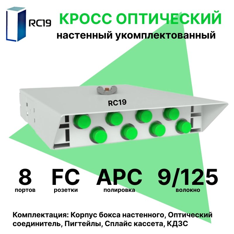 Описание RC19 ШКОН-У-8-FC/APC-9/125 Кросс оптический настенный на 8 портов FC/APC 9/125мкм укомплектованый(пигтейл FC/APC 9/125-8шт, розетка FC-8шт, ложемент, КДЗС-8шт) Оптический настенный бокс укомплектованный 8 FC/APC