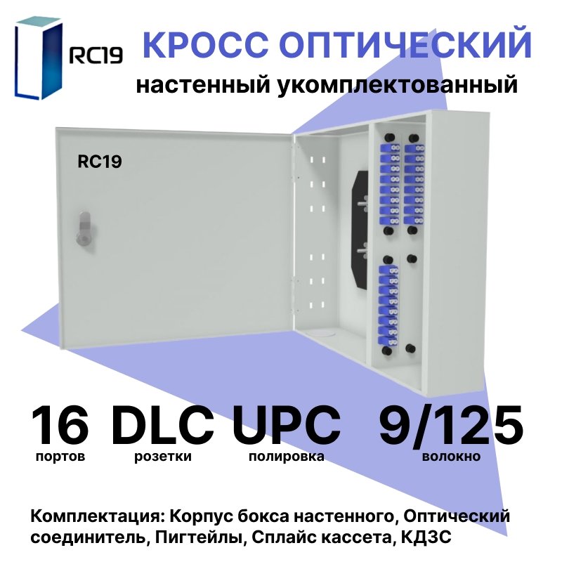 Описание RC19 ШКОН-У-16-DLC/UPC-9/125 Кросс оптический настенный на 16 портов LC/UPC duplex 9/125мкм укомплектованый(пигтейл LC/UPC 9/125-32шт, розетка DLC-16шт, планки SC/DLC, сплайс кассета с крышкой-1шт, КДЗС-32шт) Оптический настенный бокс укомплектованный 1