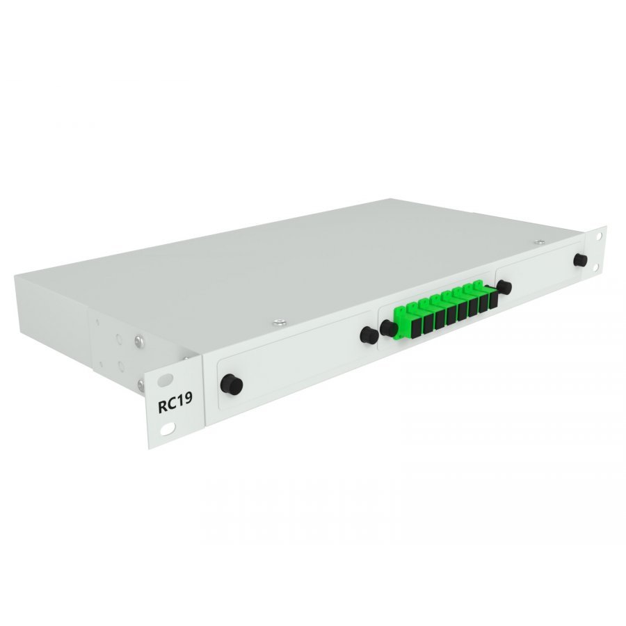RC19 ШКОС-У-19-1U-8-DLC/APC-9/125 Кросс оптический 19" стоечный 1U на 8 портов LC/APC duplex 9/125мкм укомплектованный оптический бокс (пигтейл LC/APC 9/125-16шт, розетка DLC/APC-8шт, КДЗС-16шт)