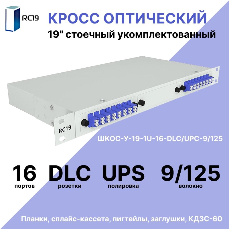 Описание RC19 ШКОС-У-19-1U-16-DLC/UPC-9/125 Кросс оптический 19" стоечный 1U на 16 портов LC/UPC duplex 9/125мкм укомплектованный оптический бокс (пигтейл LC 9/125-32шт, розетка DLC-16шт, КДЗС-32шт)
