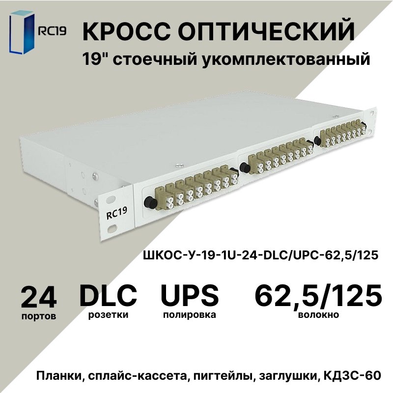 RC19 ШКОС-У-19-1U-24-DLC/UPC-62,5/125 Кросс оптический 19" стоечный 1U на 24 порта DLC/UPC 62,5/125мкм укомплектованный оптический бокс (пигтейл LC 62,5/125-48шт, розетка DLC-24шт, КДЗС-48шт)