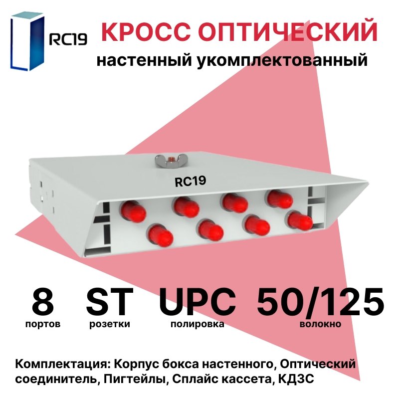 RC19 ШКОН-У-8-ST/UPC-50/125 Кросс оптический настенный на 8 портов ST 50/125мкм предсобранный (пигтейл ST 50/125-8шт, розетка ST-8шт, ложемент, КДЗС-8шт) Оптический настенный бокс укомплектованный 8 ST/UPC