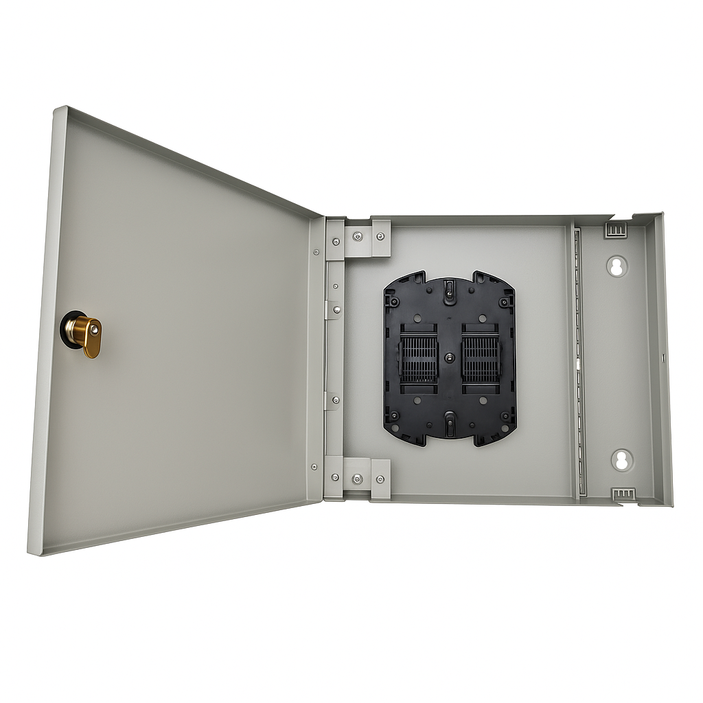 - Бокс оптический настенный на 16 портов под адаптеры типа ST/FC - металлический ящик с распашной дверью, который устанавливается на стену.