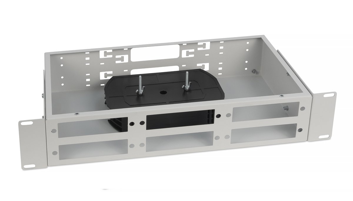Представляет собой металлический бокс высотой 2U со съемной крышкой и сменными адаптерными панелями. Предназначен для установки в стандартные телекоммуникационные шкафы и стойки формата 19”