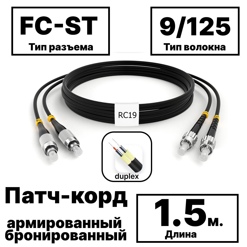 RC19 PC-ARM-2x3,0-2FC/UPC-2ST/UPC-SM-1.5м-LSZH-BK Патч-корд оптический армированный бронированный duplex FC-ST 9/125 (G.657A1) одномодовый SM (3.0мм) LSZH, цвет черный, 1,5м
