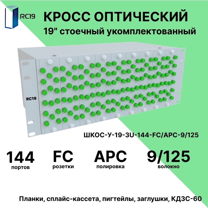 RC19 ШКОС-У-19-4U-144-FС/APC-9/125 Кросс оптический 19" стоечный 4U на 144 порта FС/APC 9/125мкм укомплектованный оптический бокс (пигтейл FС/APC 9/125-144шт, розетка FС-144шт, КДЗС-144шт)