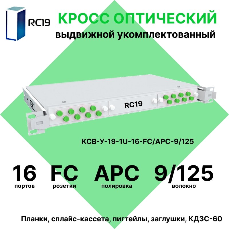 Описание и Характеристики RC19 КСВ-У-19-1U-16-FC/APC-9/125 Кросс оптический 19" выдвижной 1U на 16 портов FC/APC 9/125мкм укомплектованный (пигтейл FC/APC 9/125-16шт, розетка FC-16шт, сплайс кассета с крышкой-1шт, КДЗС-16шт) купить недорого в интернет-магазине «Анбик»