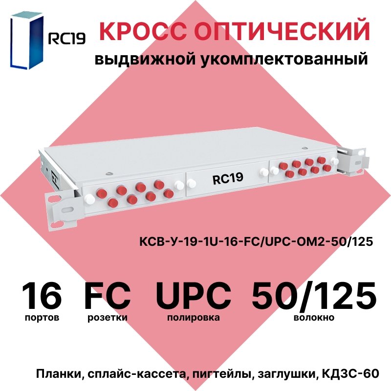 RC19 КСВ-У-19-1U-16-FC/UPC-OM2-50/125 Кросс оптический 19" выдвижной 1U на 16 портов FC 50/125мкм укомплектованный (пигтейл FC 50/125 (OM2)-16шт, розетка FC-16шт, сплайс кассета с крышкой-1шт, КДЗС-16шт)