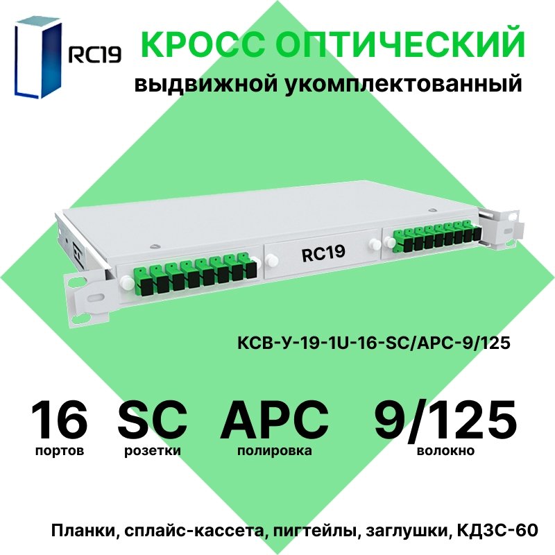 RC19 КСВ-У-19-1U-16-SC/APC-9/125 Кросс оптический 19" выдвижной 1U на 16 портов SC/APC 9/125мкм укомплектованный (пигтейл SC/APC 9/125-16шт, розетка SC-16шт, сплайс кассета с крышкой-1шт, КДЗС-16шт)