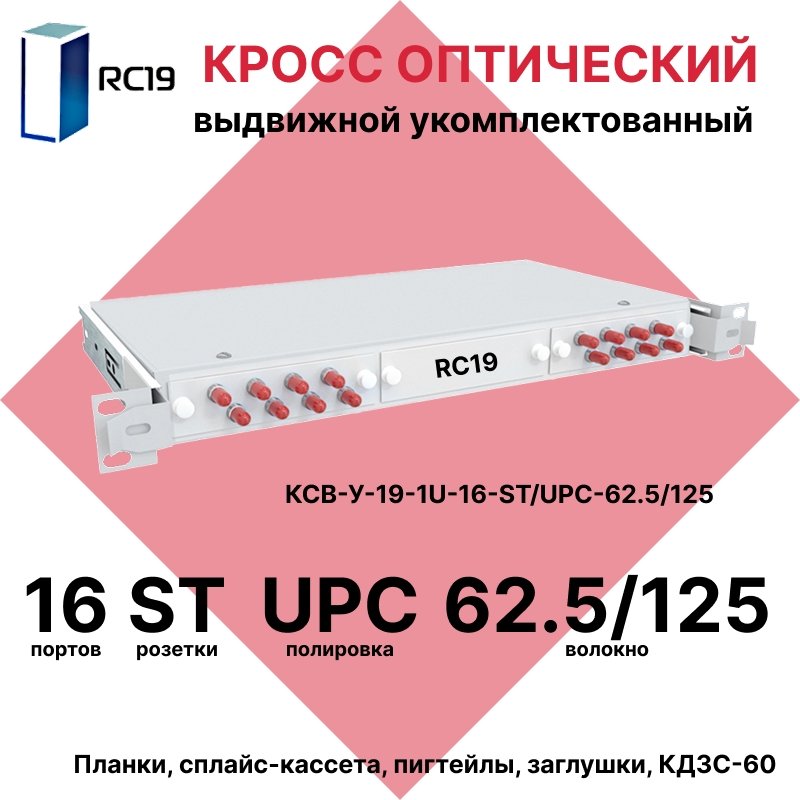 RC19 КСВ-У-19-1U-16-ST/UPC-62.5/125 Кросс оптический 19" выдвижной 1U на 16 портов ST 62,5/125мкм укомплектованный (пигтейл ST 62,5/125-16шт, розетка ST-16шт, сплайс кассета с крышкой-1шт, КДЗС-16шт): полное описание, характеристики, инструкции, отзывы покупателей, фотографии. Широкий выбор на сайте anbik.ru