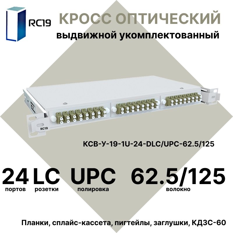 RC19 КСВ-У-19-1U-24-DLC/UPC-62.5/125 Кросс оптический 19" выдвижной 1U на 24 портов DLC 62,5/125мкм укомплектованный (пигтейл LC 62.5/125-48шт, розетка DLC-24шт, сплайс кассета - 2шт, крышка для сплайс кассеты-1шт, КДЗС-48шт): полное описание, характеристики, инструкции, отзывы покупателей, фотографии. Широкий выбор на сайте anbik.ru
