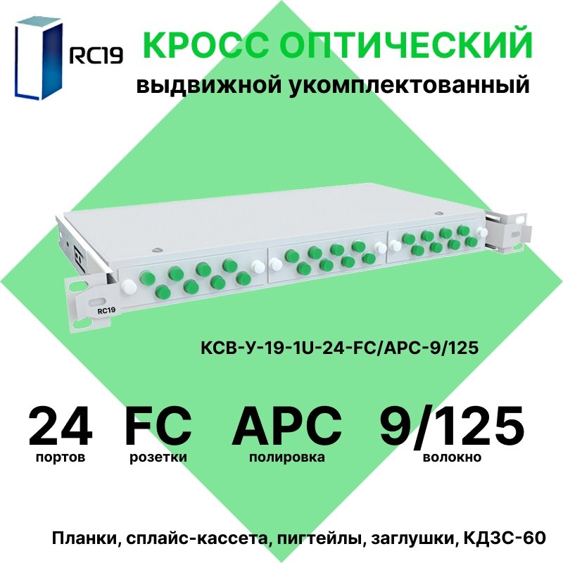 RC19 КСВ-У-19-1U-24-FC/APC-9/125 Кросс оптический 19" выдвижной 1U на 24 портов FC/APC 9/125мкм укомплектованный (пигтейл FC/APC 9/125-24шт, розетка FC-24шт, сплайс кассета с крышкой-1шт, КДЗС-24шт)