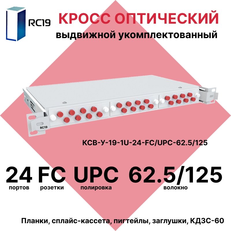 Описание и Характеристики RC19 КСВ-У-19-1U-24-FC/UPC-62.5/125 Кросс оптический 19" выдвижной 1U на 24 портов FC 62,5/125мкм укомплектованный (пигтейл FC 62,5/125-24шт, розетка FC-24шт, сплайс кассета с крышкой-1шт, КДЗС-24шт) купить недорого в интернет-магазине «Анбик»