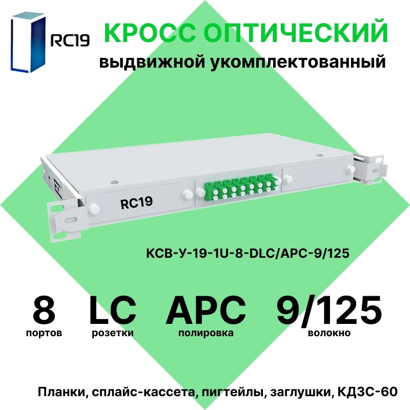 RC19 КСВ-У-19-1U-8-DLC/APC-9/125 Кросс оптический 19" стоечный 1U на 8 портов LC/APC duplex 9/125мкм укомплектованный (пигтейл LC/APC 9/125-16шт, розетка DLC-8шт, сплайс кассета с крышкой-1шт, КДЗС-16шт)