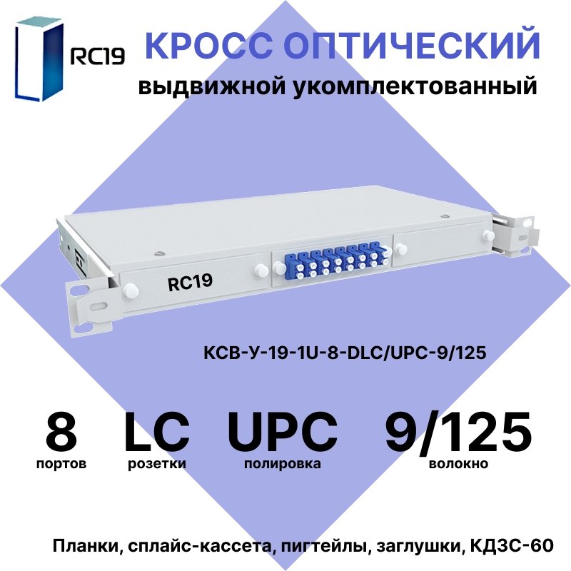 RC19 КСВ-У-19-1U-8-DLC/UPC-9/125 Кросс оптический 19" выдвижной 1U на 8 портов LC/UPC duplex 9/125мкм укомплектованный (пигтейл LC/UPC 9/125-16шт, розетка DLC-8шт, сплайс кассета с крышкой-1шт, КДЗС-16шт)