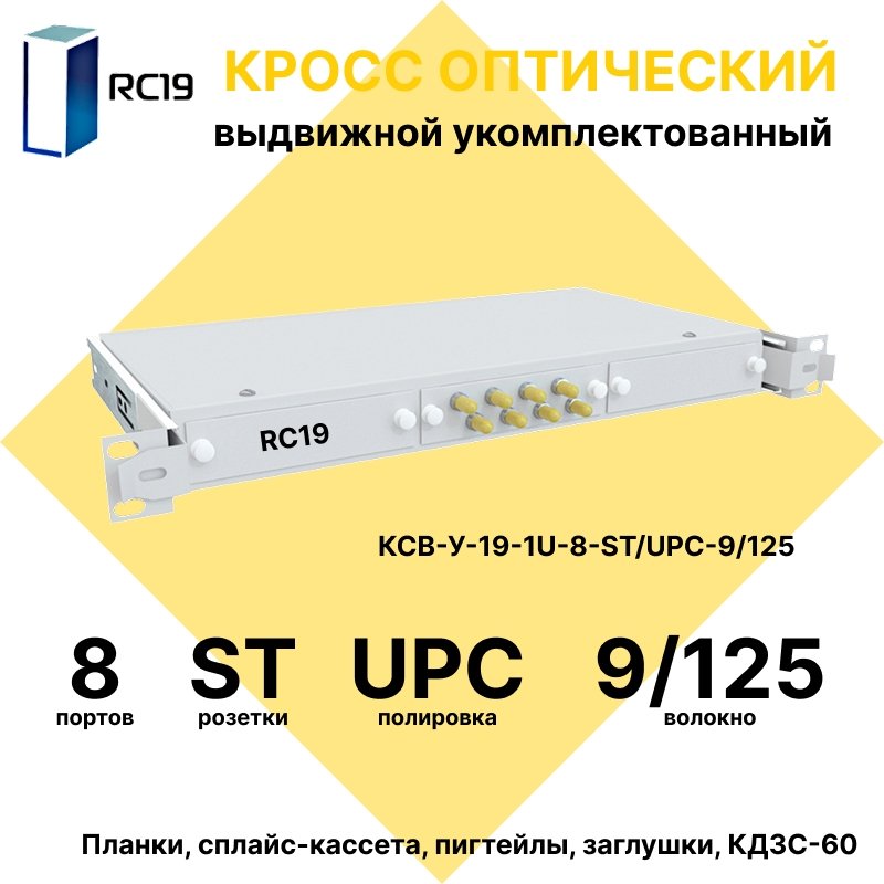 RC19 КСВ-У-19-1U-8-ST/UPC-9/125 Кросс оптический 19" выдвижной 1U на 8 портов ST/UPC 9/125мкм укомплектованный (пигтейл ST 9/125-8шт, розетка ST-8шт, сплайс кассета с крышкой-1шт, КДЗС-8шт) полное описание, характеристики, инструкции, отзывы покупателей, фотографии. Широкий выбор на сайте anbik.ru