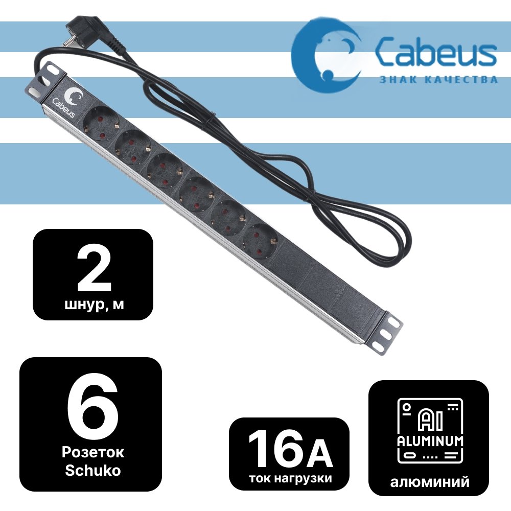 Cabeus PDU-6P-2EU Блок евророзеток для 19" шкафов, горизонтальный, 6 розеток, 16 A, без выключателя, шнур 2м, алюминиевый корпус, немецкий стандарт