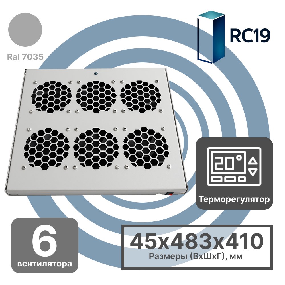 Модуль вентиляторный 19 дюймов (19") на 6 куллеров (120х120х38 мм) с терморегулятором серого цвета Ral 7035 предназначен для установки на 19" профили серверного шкафа серого цвета производства RC19, работает на отвод теплого воздуха