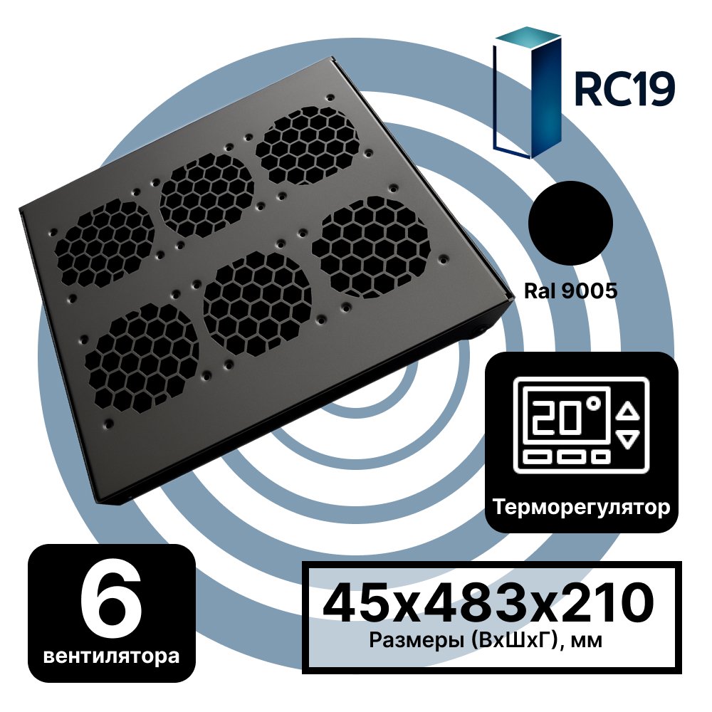 Модуль вентиляторный 19 дюймов (19") на 6 куллеров (120х120х38 мм) с терморегулятором черного цвета Ral 9005 предназначен