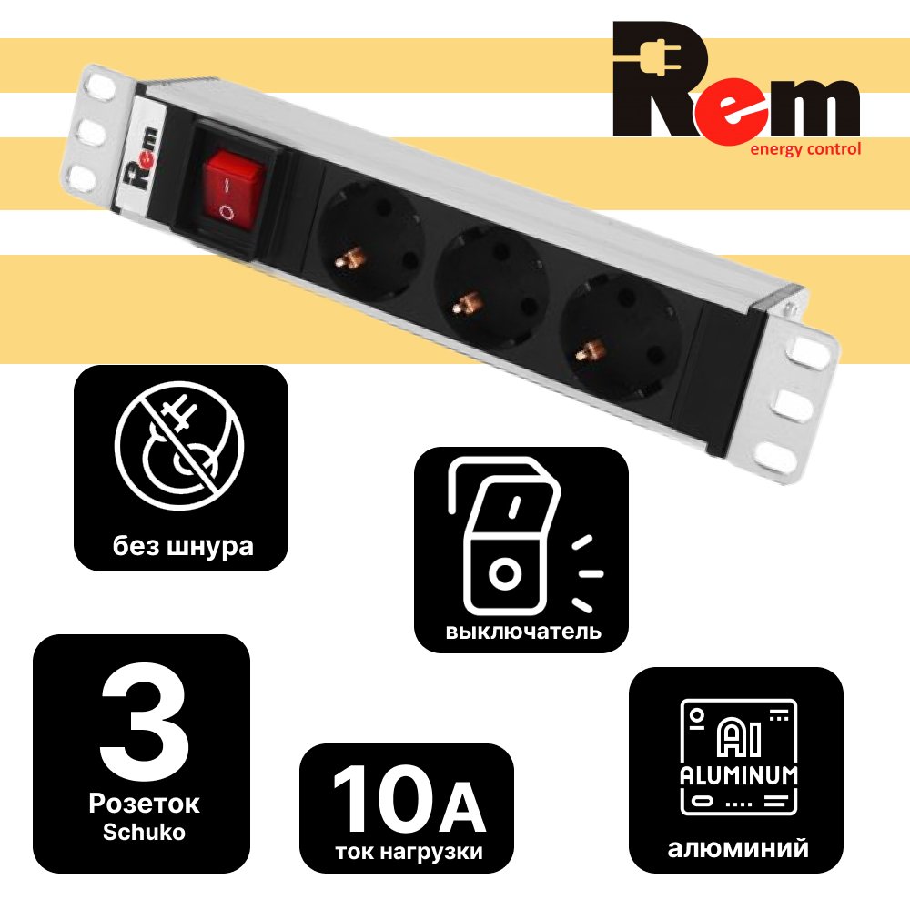 Описание Блок розеток Rem-10 без шнура с выключателем, 3 Sсhuko, вход IEC 60320 C14, 10A, алюминиевый 10"