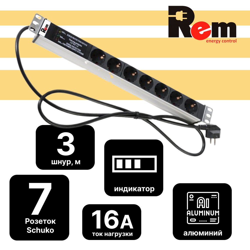 Описание Блок розеток Rem-16 с фильтром и индикатором, 7 Schuko, 16A, алюминиевый 19", шнур 3 м.