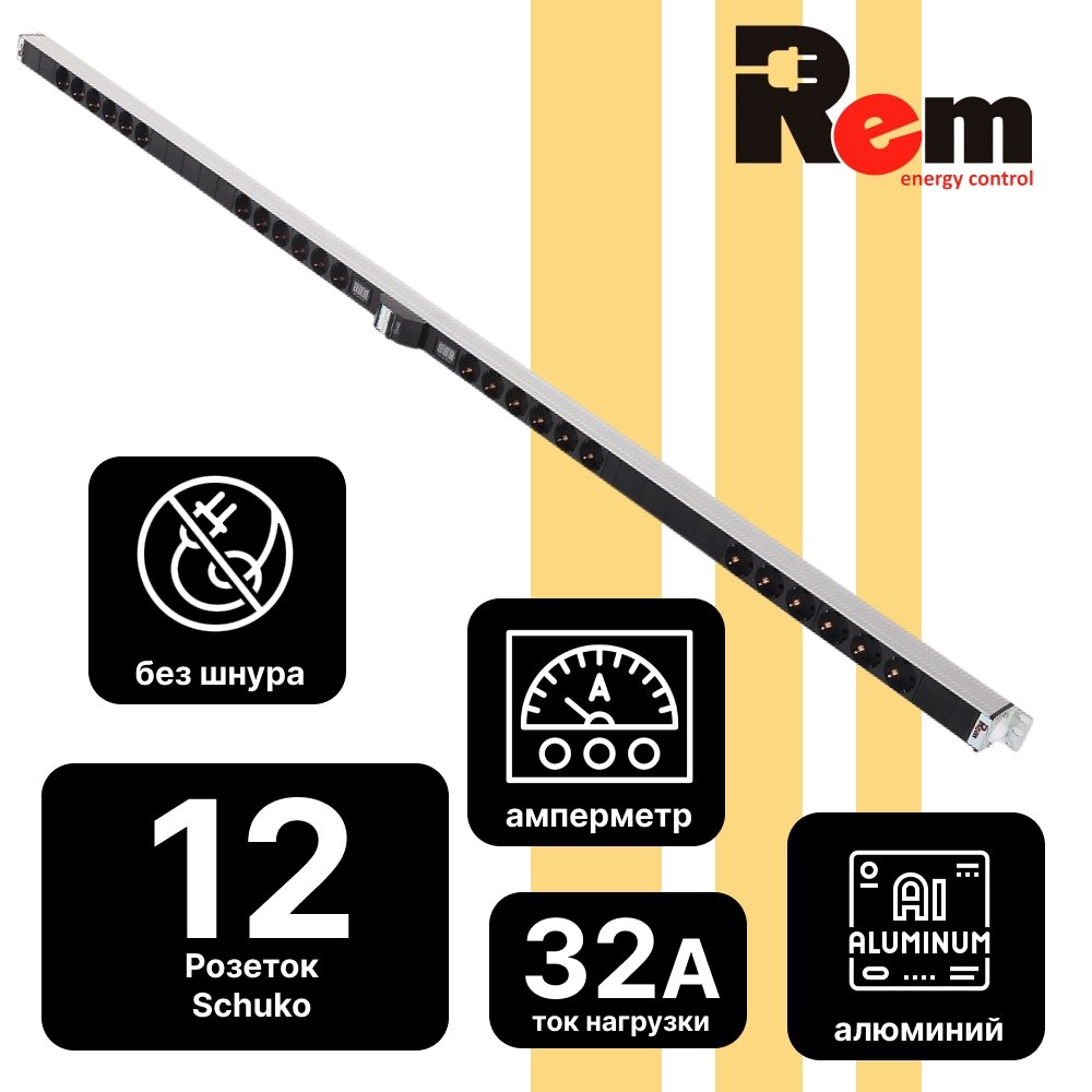 Описание Вертикальный блок розеток Rem-32 на 2 контура по 12 Sсhuko с авт. и амп., 2*32А, алюм., 42-48U, колодка