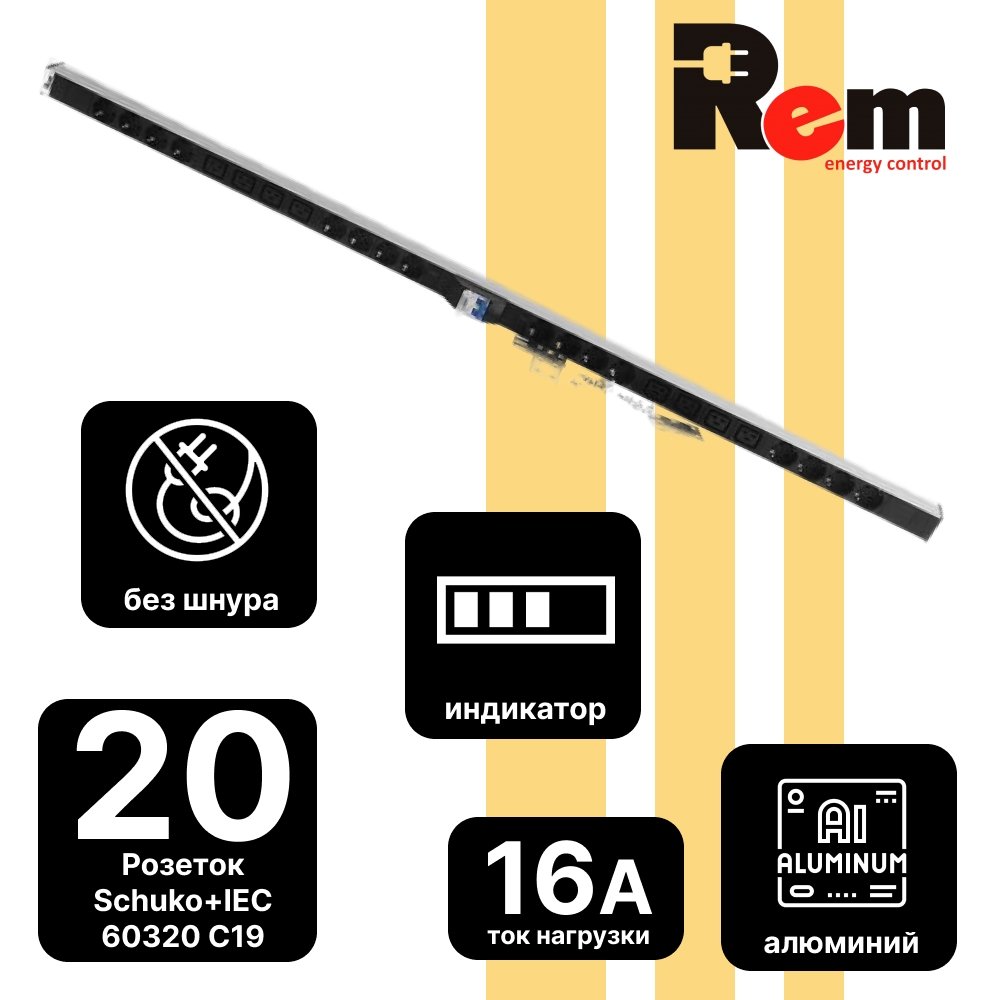 Вертикальный блок розеток REM - R-32-2X(8S-4C19-A-I) с автоматом защиты и разъёмами стандарта Schuko и IEC 60320 C19 на 2 контура, в анодированном алюминиевом корпусе. На лицевой части блока установлен индикатор питания. Розетки расположены под углом 45%, для удобного подсоединения коленчатых штекеров. Для подключения внешнего шнура (кабеля) предусмотрена клеммная колодка под провод номинальным сечением до 2,5 мм2. Совместим со всеми линейками 19” монтажного оборудования. Выполнен в системе несущих конструкций 482,6 мм по ГОСТ 28601.2 (19-дюймовые конструктивы по МЭК 297).