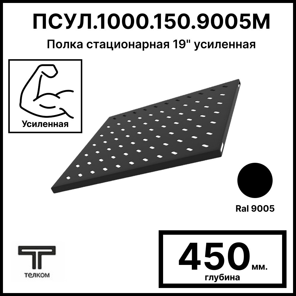 ТЕЛКОМ ПСУЛ.450.150.9005М Полка стационарная 19" усиленная до 150кг Глубина=450мм для напольных шкафов ТС с глубиной 600мм, цвет черный RAL9005