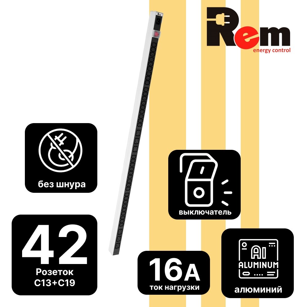 Купить Верт блок розеток Rem-16, 1 фаза 16A, выкл, 36 C13, 6 C19, 1420 мм, вх C20 IEC 320 в компании ANBIK по привлекательной цене.