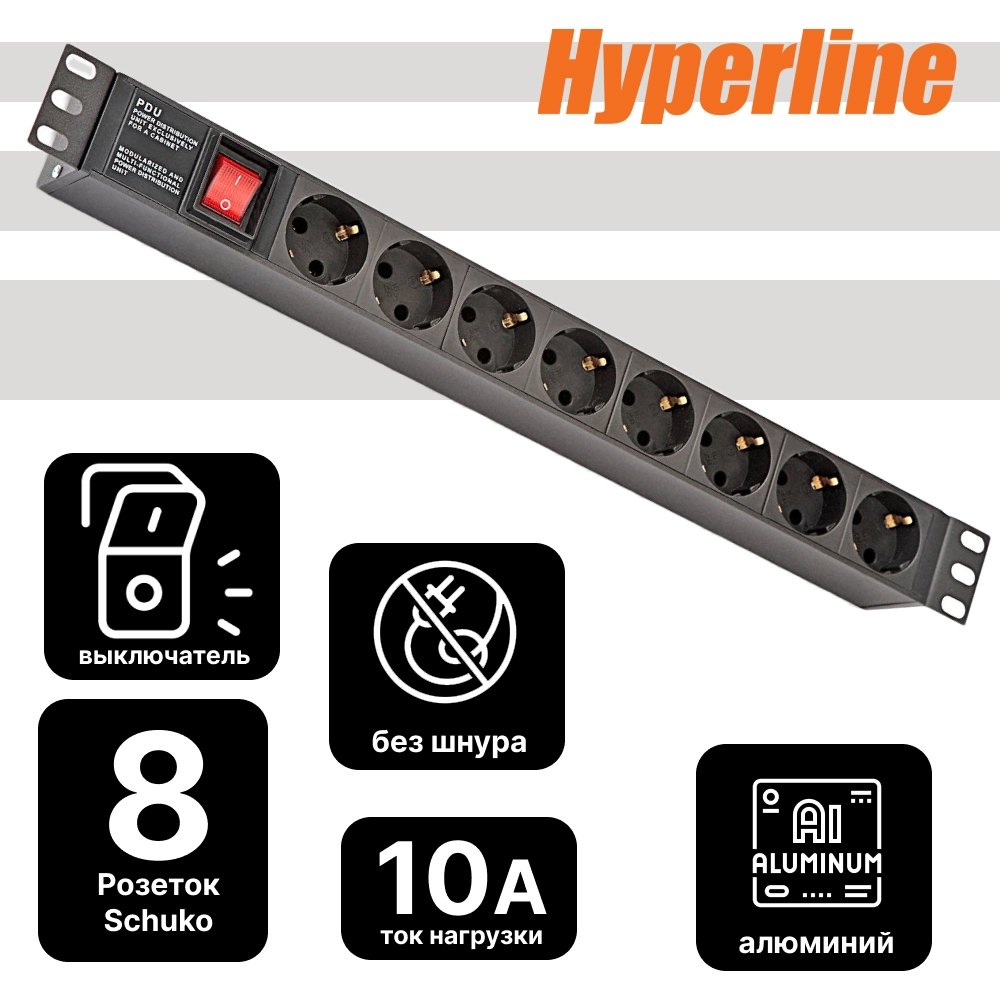Описание и Характеристики Hyperline Блок розеток для 19" шкафов, горизонтальный, 8 универсальных розеток, 16A, выключатель, шнур 2.5м купить в интернет-магазине «Анбик»