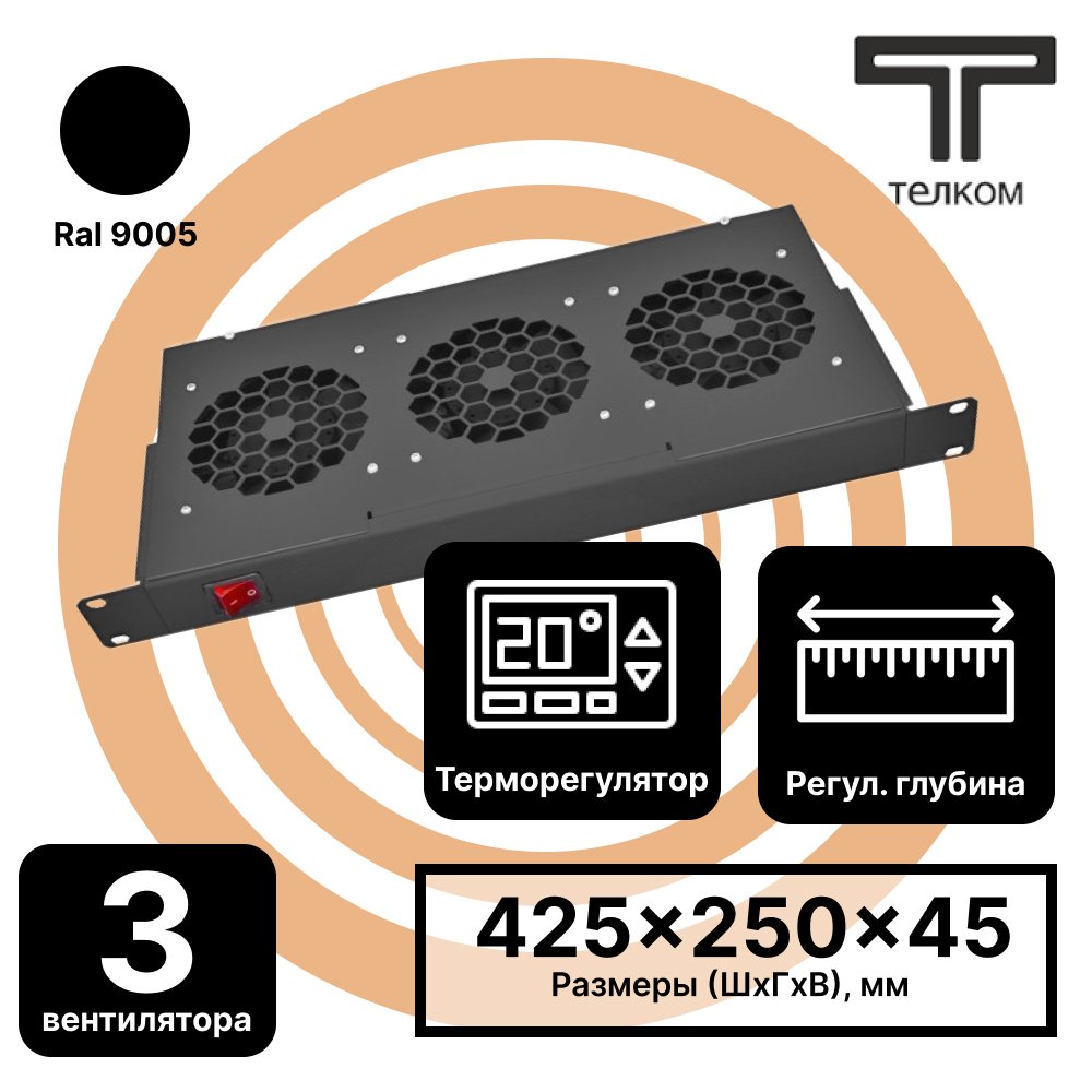 ТЕЛКОМ ВМ-19-3-Т.9005 Вентиляторный 19" модуль 1U (3 вентилятора) с терморегулятором (термостат 0-60°C), c регулируемой глубиной 200-310мм, цвет чёрный (RAL9005): полное описание, характеристики, инструкции, отзывы покупателей, фотографии. Широкий выбор на сайте anbik.ru