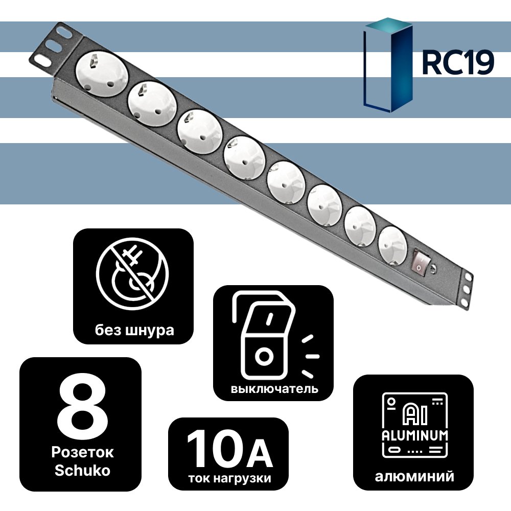 Описание и Характеристики RC19 PDU-EY01B-1U-KL-10А Блок евророзеток для 19" шкафов, горизонтальный, 8 розеток, 10 A, выключатель, клемный ввод_ купить недорого в интернет-магазине «Анбик»