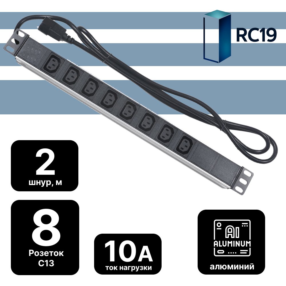 RC19 PDU-EY01B-1U-1C8 Блок розеток для 19" шкафов, горизонтальный, 8 розеток IEC 320 C13, 10 A, без выключателя, алюминиевый корпус, шнур 2 м, вилка IEC 320 C14: полное описание, характеристики, инструкции, отзывы покупателей, фотографии. Широкий выбор на сайте anbik.ru