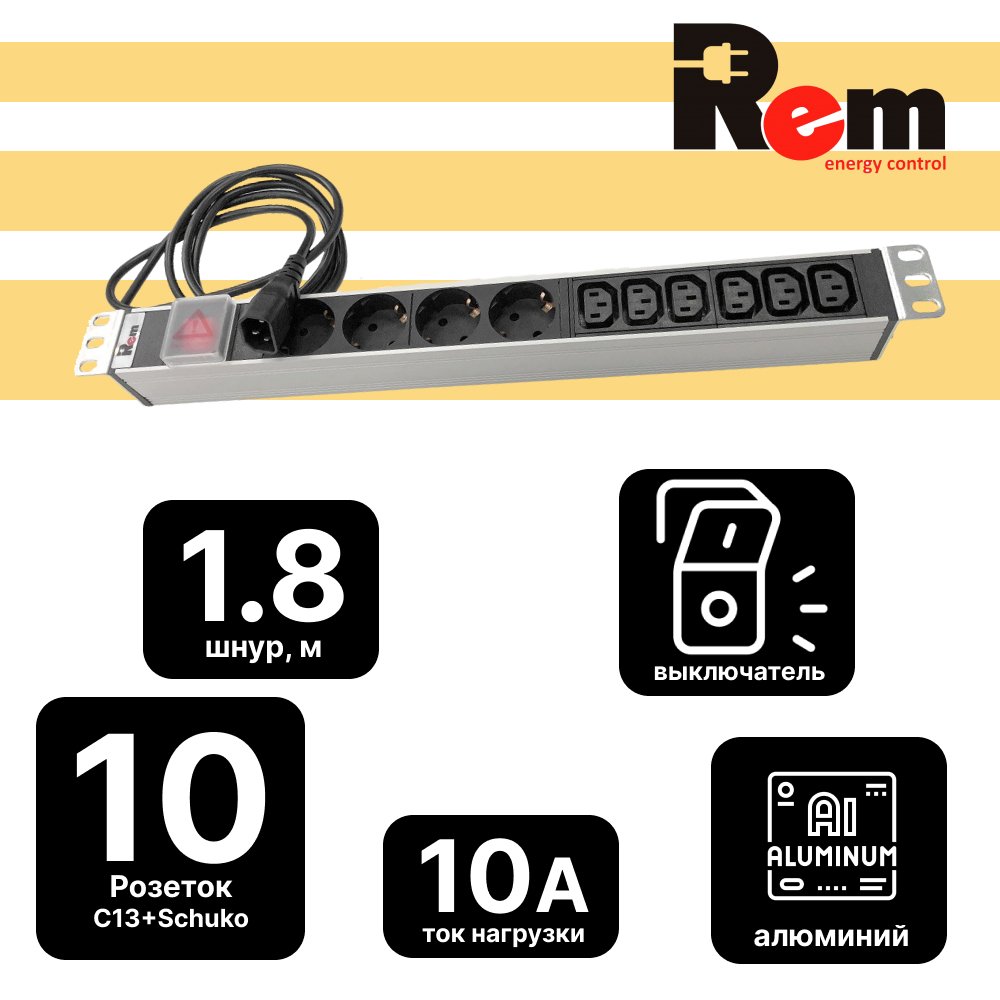 Блок розеток Rem-10 с выкл., 4 Sсhuko, 6 IEC 60320 C13, 10 A, алюм., 19", шнур 1,8 м. IEC 60320 C14: полное описание, характеристики, инструкции, отзывы покупателей, фотографии. Широкий выбор на сайте anbik.ru
