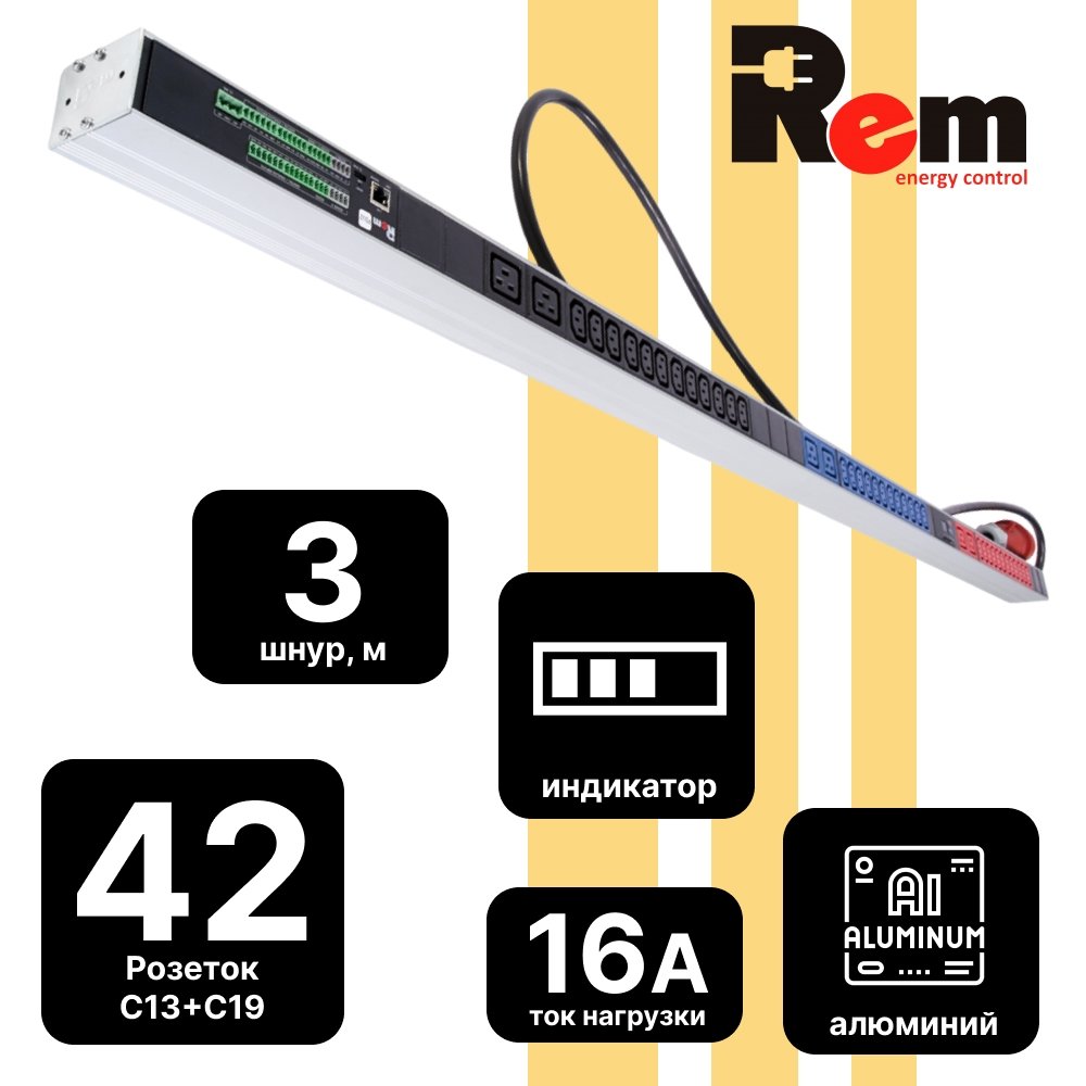 Rem R-2MC3-3x16-36C13-6C19-MI-1820-3-3PN Верт блок розеток Rem-2MC,LINUX,мониторинг,измерение,3~16A,36C13,6C19,1820мм,вхIEC309,шнур 3м