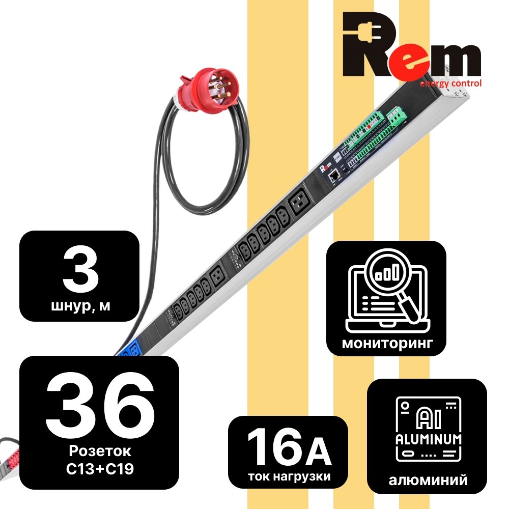 Rem R-2MC3-3x16-30xC13-6xC19-MCL-1820-3-3PN Верт блок розеток Rem-2MC, Linux, мониторинг, измерение, управление, 3 фазы 16A, 30C13, 6C19, 1820 мм, вх IEC 309, шнур 3м: полное описание, характеристики, инструкции, отзывы покупателей, фотографии. Широкий выбор на сайте anbik.ru