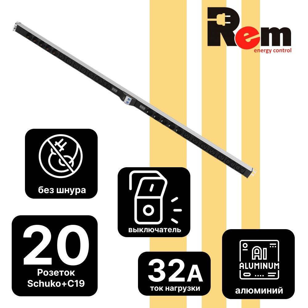 R-32-10S-8C13-10C19-A-Am-1420-К Вертикальный блок розеток Rem-32 без шнура с авт., и амп., 10 Sсhuko, 10 IEC 60320 C19, 8 IEC 60320 C13, 32 А, алюм., 33...38U, колодка