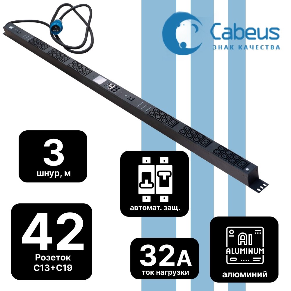 Описание и Характеристики Cabeus SMART-PDU-32-1P-36C13-6C19-I309-CM Блок распределения питания, вертикальный, 36 розеток IEC 320 C13, 6 розеток IEC 320 C19, 1 фаза, 32А, 2х16А, автомат защиты, 250В, мониторинг/управление, шнур 3м 3х6мм с вилкой IEC 60309 купить недорого в интернет-магазине «Анбик»